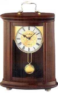 Walnut finish wood lantern mantel clock has fluted sides, polished goldtone double-bar pendulum and handle, and scrolled goldtone dial.
