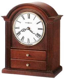 Arch-top clock mantel clock Windsor Cherry finish, fluted columns, and polished brass-tome bezel. Two felt-lined jewelry drawers.