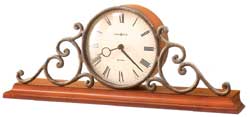 New Haven Cherry on select hardwoods and veneers. Mantel clock features tambour styled metal scrolls.