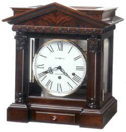 Finished in Americana Cherry, select hardwoods and veneers, Decorative reeded columns frame the dial and reproduction hardware adds distinctive touch to the capitals, column bases, decorative rings, and front/rear feet. Roman numerals. Aged to match the era, Keywound Westminster chime, silence option and durable bronze bushings