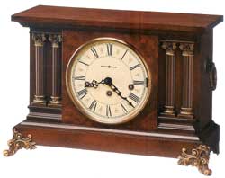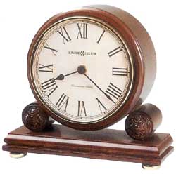 Round mantel clock with rosette supports on a wood base, Windsor Cherry finished on select materials, hardwoods, and veneers.