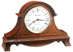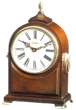 This unique mantel clock features an arch shaped American Alder wood case with metal finial, lion's head handles, and brass feet. Dial is raised ivory-colored metal with Roman numerals. Requires one AA battery.